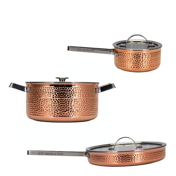 Vargen & Thor Mjölner är ett grytset i 3 delar med lock – en stilren och långsiktig investering för alla typer av matlagning. Setet består av grytan Miranda (4 l), kastrullen Vera (1,6 l) och traktörpannan Modell Y (28 cm), samtliga med medföljande glaslock. Utsidan är av äkta, vacker koppar och insidan av borstat rostfritt stål som minskar risken för att maten bränner fast. Handtagen i rostfritt stål är hållbara och värmetåliga, vilket gör att kärlen fungerar lika bra till vardags som vid större tillfällen.