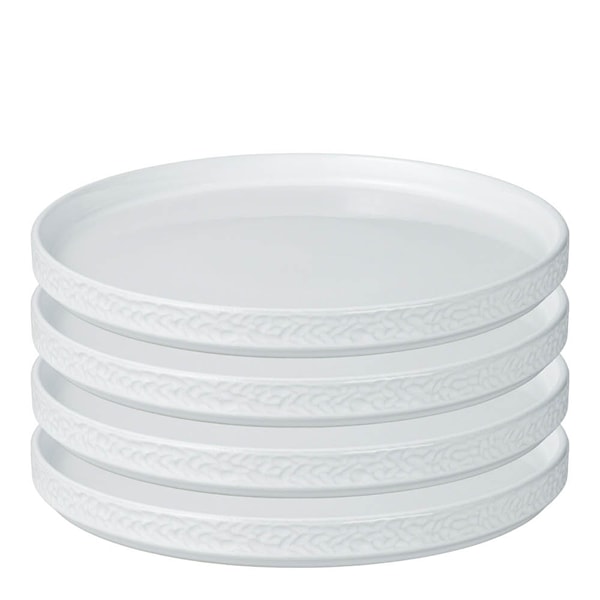 Tallrikarna är tillverkade i tåligt stengods som tål diskmaskin, vilket gör dem praktiska för både vardagsbruk och festliga dukningar. Den vita basen med det eleganta motivet framhäver maten och skapar en vacker helhet på bordet.