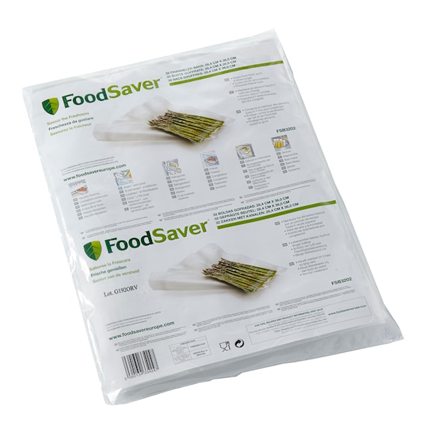 Frys- och värmepåsar till FoodSaver vakuumförpackare. Plasten är BPA-fri. Går att använda i frys, mikrovågsugn (upptining) och i kokande vatten. Påsarna är av betydligt tjockare och tåligare plast än de fryspåsar som säljs i matbutik. Förpackningen innehåller 32 påsar à 3,78 liter.