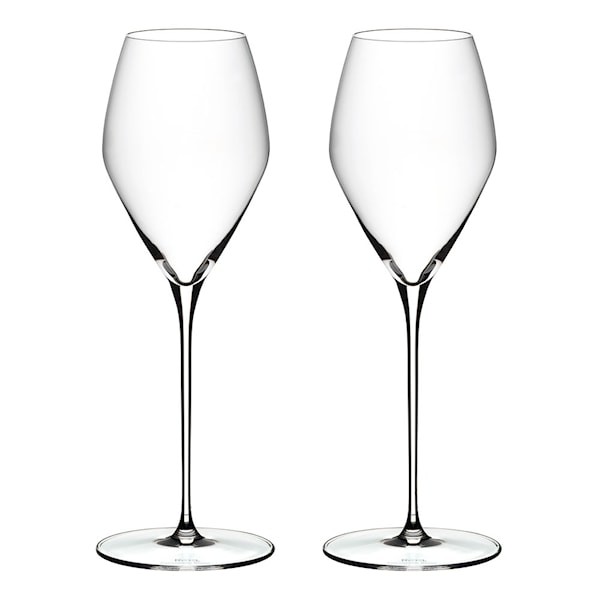 Riedels serie Veloce har fått sitt namn från italienskans ord för snabb. De vackra vinglasen utmärker sig med en kupa i tunn kristall och en smal, hög stam. Den eleganta känslan förstärks av att kuporna har en diamantformad design. Precis som Riedels andra glasserier är Veloce-glasen druvspecifika. På foten av varje glas finns en märkning som säger vilken druva kupan passar till.