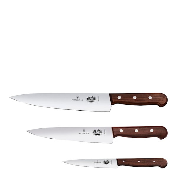 En uppsättning allsidiga knivar presenterade i en presentask. Setet innehåller kocknivar med bladlängder på 12 centimeter, 19 centimeter och 22 centimeter. Knivarna har robusta trähandtag i en elegant design som polerats för hand för att ge ett bekvämt grepp. Kökskniven på 12 centimeter är perfekt för att skära små frukter och grönsaker med och är den perfekta följeslagaren till kockknivarna på 19 centimeter och 22 centimeter som båda skär med skärpa i både rått och tillagat kött utan att förstöra köttets fibrer. De är också utmärkta för att dela upp större, hårdare frukter och grönsaker med som till exempel melon och kål.