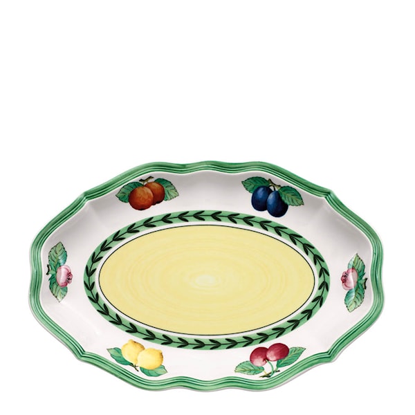 French Garden Fleurence fat till såskanna från Villeroy & Boch. Detta fat mäter 24x16 cm är dekorerat med de välkända fruktmotiven i milda färger och fulländar dukningen med elegans. Skapad för att matcha seriens såssnipa, men kan även användas som ett litet uppläggningsfat.