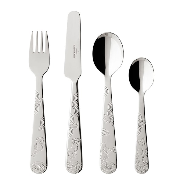 Besticksetet innehåller en kniv, en gaffel samt en liten och en stor sked – allt tillverkat av slitstarkt och lättskött rostfritt stål. Designen är särskilt anpassad för barn, så att de enkelt kan lära sig att äta själva.