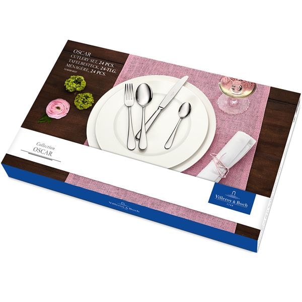 Oscar bestickset 24 delar från Villeroy & Boch är ett elegant och mångsidigt set för alla tillfällen. Med sina svagt böjda linjer och präglade handtag blir det en vacker del av varje dukning.