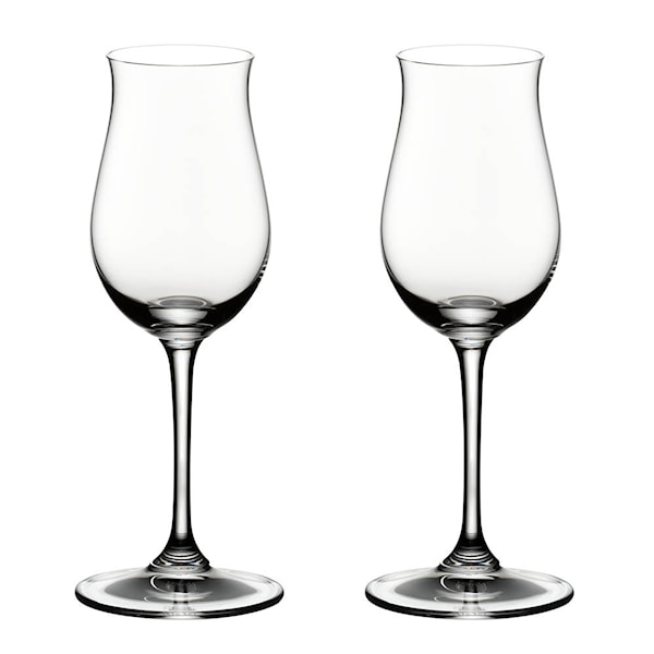 Cognacglas i 2-pack från Riedels serie Vinum. Cognacglaset är särskilt framtaget för fatlagrad sprit med rund och mjuk karaktär. Glaset är relativt litet och har en långsmal, tulpanformad kupa. Kupan förhöjer upplevelsen av Cognac genom att dämpa den stickiga alkoholdoften och istället låta dryckens söta, komplexa aromer komma fram.