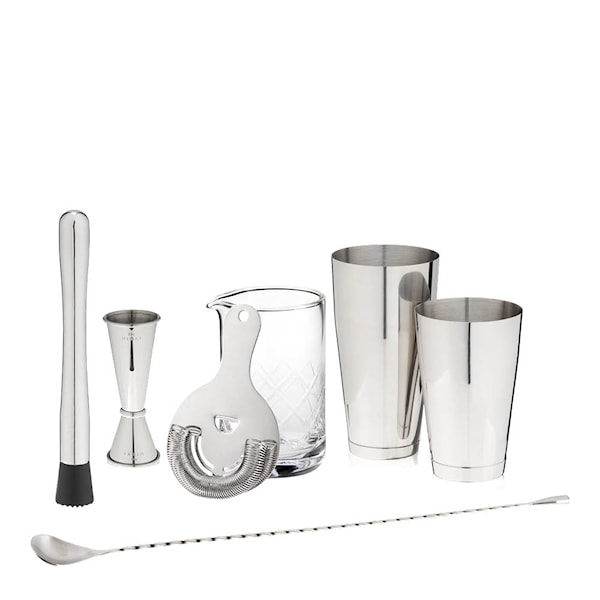 Setet innehåller ett elegant blandglas i kristall som rymmer 27 cl och kan diskas i maskin. Dessutom ingår två shakers på 28 cl respektive 18 cl, ett jigger med tre nivåer (4,5 / 2,2 / 1,5 cl), en Hawthorne-sil, en viktad barsked som ger bra kontroll vid omrörning samt en robust muddler som effektivt frigör smak från lime, mynta eller bär. Alla verktyg, förutom blandglaset, är tillverkade i rostfritt stål och bör handdiskas för att behålla sin glans.