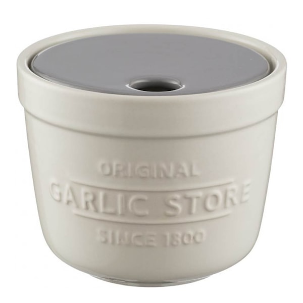 Klassisk vitlöksgömma i tåligt stengods som gärna står framme på köksbänken