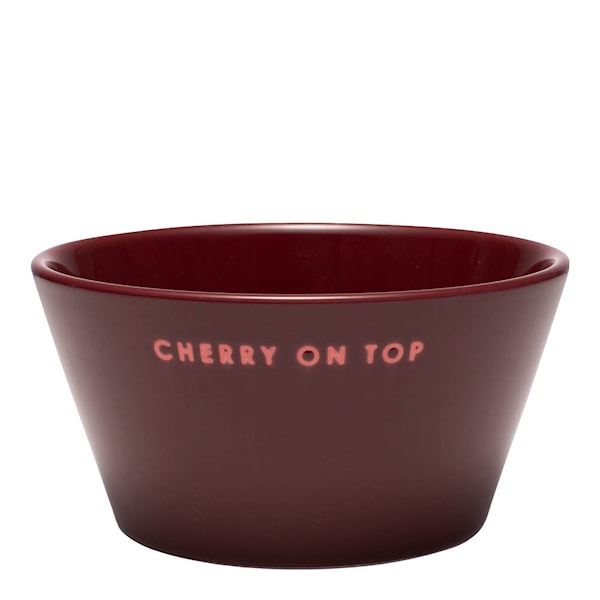 Vondels Table Talk skål CHERRY ON TOP 7 cm i burgundy är en dekorativ och personlig liten skål som ger extra glans till allt från frukostbord till efterrätt. Den handstämplade texten gör varje exemplar unikt och tillför både värme och humor.