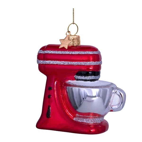 Bjud in bakglädjen till granen med detta julhänge från Vondels i form av en röd köksmaskin med opalglans. Den munblåsta och handmålade ytan ger ett exklusivt uttryck, samtidigt som formen tillför en lekfull och personlig ton bland julkulorna.