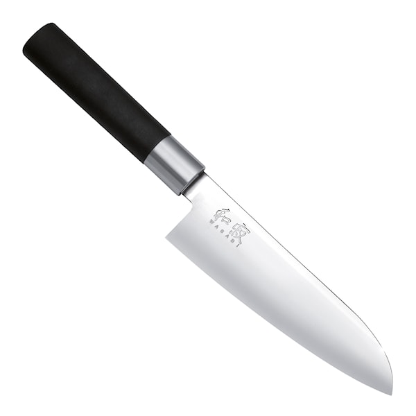 Japansk santokukniv från KAI med högt blad som passar utmärkt som universalkniv för att skära kött och grönsaker. Tillverkad av rostfritt stål med hög kolhalt 1K6 och handtag bambupulver och polypropen, vilket ger en optimal hygein tack vare bambuns naturliga anti-bakteriella egenskaper.