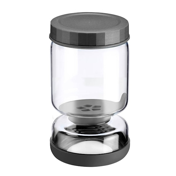 Burken är tillverkad i slitstarkt borosilikatglas med delar i silikon och polypropen. Den är helt tät, tål maskindisk och har en avtagbar sil för enkel rengöring. En genomtänkt produkt för ett genomtänkt kök.