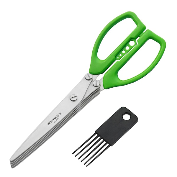 Den praktiska örtsaxen från Westmark är ett fantastiskt redskap. Med sina fem blad klipper du enkelt örterna i perfekt storlek och när du är klar borstar du enkelt bort örtresterna med dem medföljande rengöringskammen. Både sax och kam tål maskindisk.