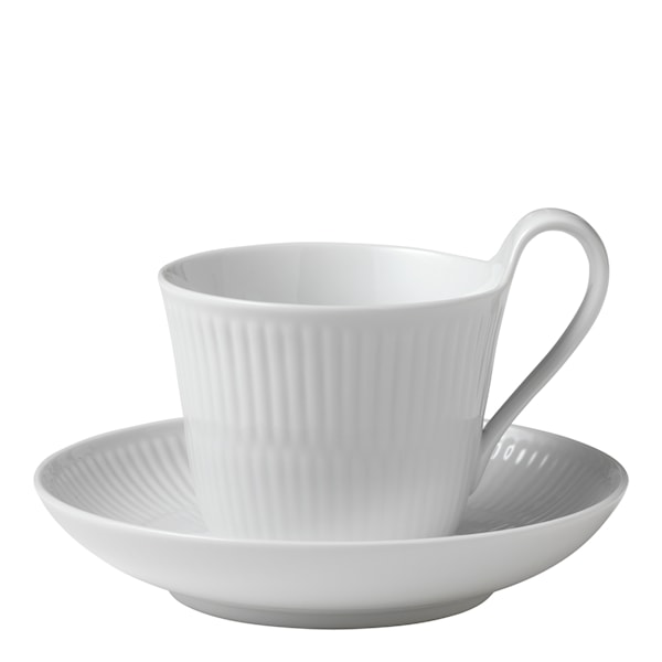 Royal Copenhagen White Fluted kopp 24 cl med fat och högt hantag är ett elegant set med kaffekopp och tillhörande fat som förenar klassisk design med modern enkelhet. Tillverkad av högkvalitativt porslin har koppen ett tidlöst räfflat mönster som ger den ett stilrent uttryck. Den rena vita glasyren gör att den passar lika bra till vardagskaffet som vid mer uppdukade tillfällen.