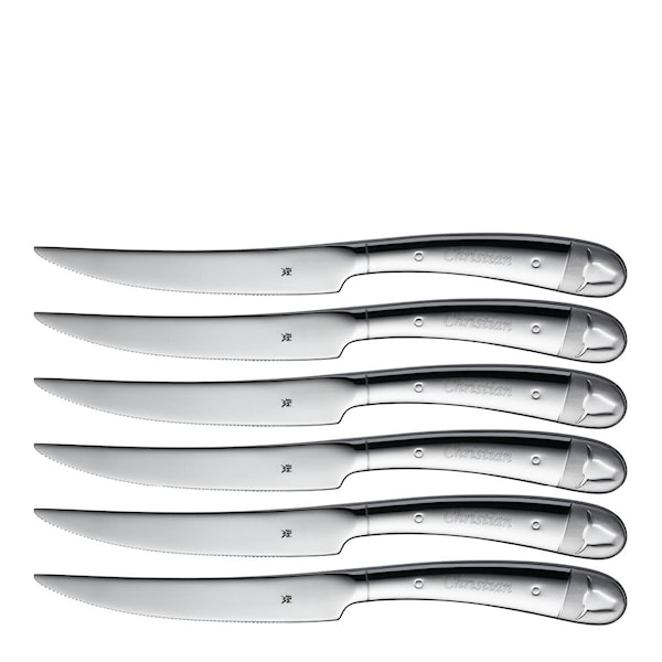 En uppsättning 6 grillknivar ur serien Nuova från WMF. En fantastisk kniv med ett blad i specialstål som enkelt skär igenom den grillade biffen eller grönsaken. En kniv i en fin, slank design med de karakteristiska nitarna på handtaget. Det lätt böjda handtaget ligger skönt i handen när du använder den. Knivarna levereras i en fin trälåda som även kan användas till förvaring av knivarna när de inte används.