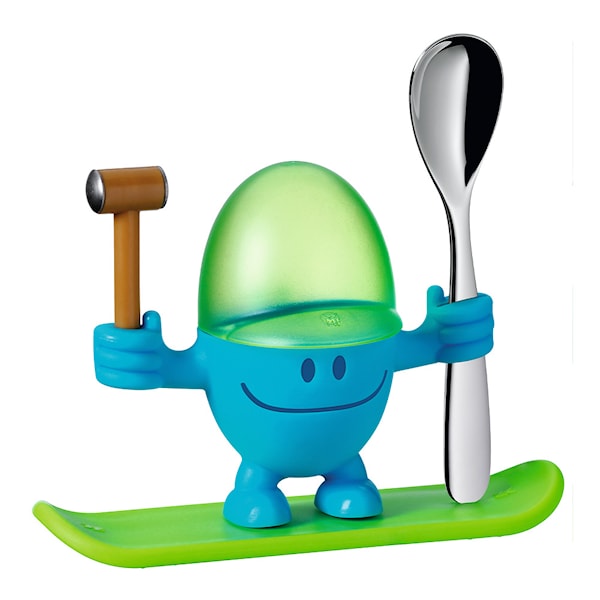 Äggkoppen McEgg från WMF glider in på frukostbordet med hammare och sked i sin hand. Den här häftiga äggkoppen kommer göra frukosten roligare och lättare för barnen. Du använder den genom att banka sönder äggets skal med hammaren som du sen lägger i McEggs keps för att till sist greppa tag om skeden och njuta av ägget. En mycket praktisk äggkopp som går att diska i diskmaskin och passar barn i åldersgruppen 3+.