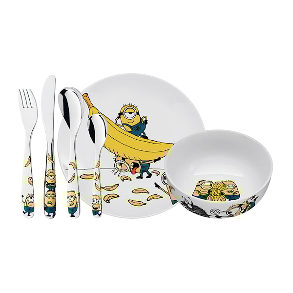 Med det här besticksetet från WMF i 6 delar blir det både roligare och lättare att lära sig hantera bestick. Besticken och porslinet är dekorerat med Minions, ett motiv barnen älskar och uppskattar. Bestickens storlek och deras handtag är perfekta för de små händerna och är anpassade efter barns motorik. Besticken är tillverkade av rostfritt stål som är slitstarkt och tål diskmaskin, likaså porslinet. Passar barn från 3 års ålder.