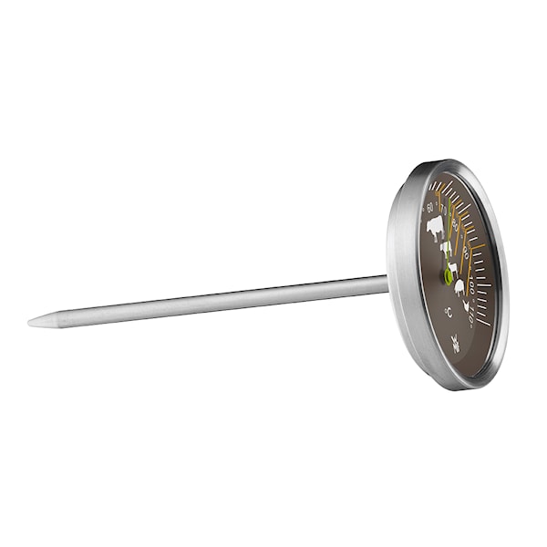 Med köttermometern från WMF får du perfekt och saftigt kött varje gång. Kontrollera temperaturen genom att sticka ner termometern i mitten av köttet och avläs enkelt temperaturen på skalan som mäter från 0°C till 110°C. Termometern är tillverkad av Cromargan® rostfritt stål 18/10 och kan även användas vid grillning. Den tål värme upp till 250°C.