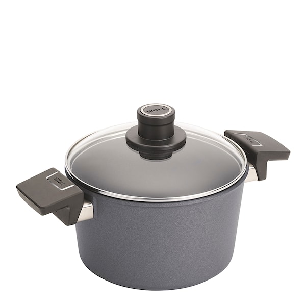Gryta i gjuten aluminium från Woll. Den har en slittålig, femskiktsbeläggning, som består till stor del av diamantpartiklar.