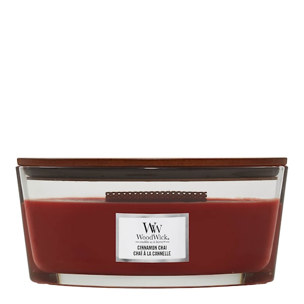 WoodWick Ellipse doftljus i doften Cinnamon Chai skapar en mysig atmosfär med sin varma blandning av kryddig kanel och fylliga vaniljtoner. Doftljuset är noggrant komponerat med flera lager som utvecklas elegant.