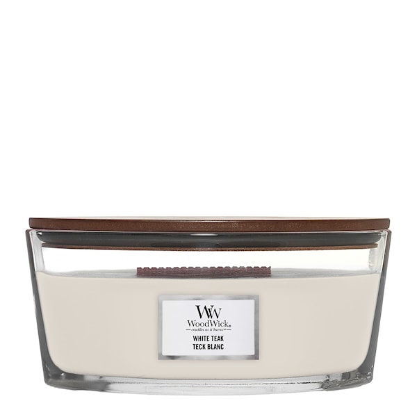 Woodwicks Ellipse doftljus White Teak erbjuder en sofistikerad blandning av dofter; friska noter av balsamgranar, sandelträ och ek, ackompanjerade av inslag av mossa och cederträ.