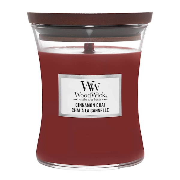 WoodWick Hourglass doftljus Cinnamon Chai i medium storlek skapar en mysig atmosfär med sin varma blandning av kryddig kanel och fylliga vaniljtoner. Doftljuset är noggrant komponerat med flera lager som utvecklas på ett elegant sätt.