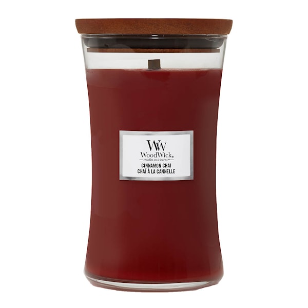 WoodWick Hourglass doftljus Cinnamon Chai i stor storlek skapar en mysig atmosfär med sin varma blandning av kryddig kanel och fylliga vaniljtoner. Doftljuset är noggrant komponerat med flera lager som utvecklas på ett elegant sätt.
