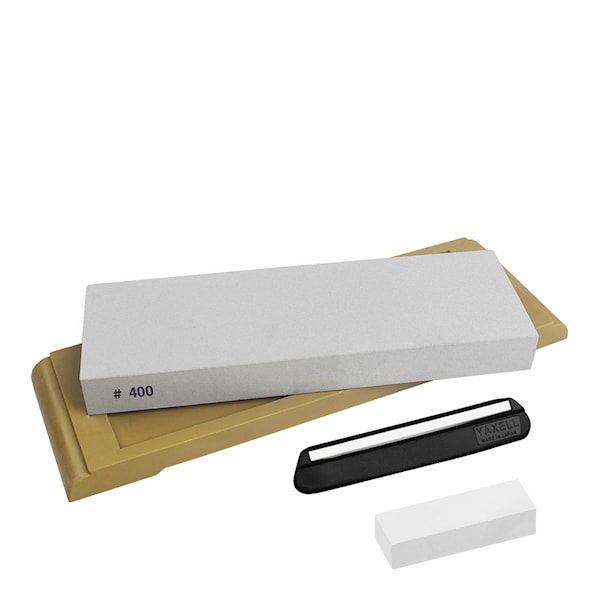 Knivtillbehör från Yaxell för att ta hand om de fina knivarna. En mycket grov slipsten (400 i kornstorlek). Slipstenen används för att slipa om riktigt slöa knivar eller för att ta bort hack i eggen. Stenen levereras med en fot i gummi, som gör att stenen ligger still när du slipar din kniv, samt ett slipstöd i plast som hjälper dig att slipa i rätt vinkel. En korrigeringssten att jämna ut slipstenen med är även inkluderad i paketet.