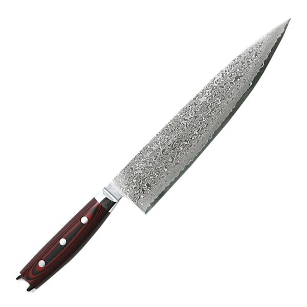 Super Gou Kockkniv 24 cm från Yaxell har 161 lager damaskerat stål är din bästa vän i köket. En mångsidig knivmodell som du kan använda till att skära, hacka och tärna de allra flesta råvaror. Tyngden i knivbladet underlättar när du arbetar med stora köttstycken och rotsaker.