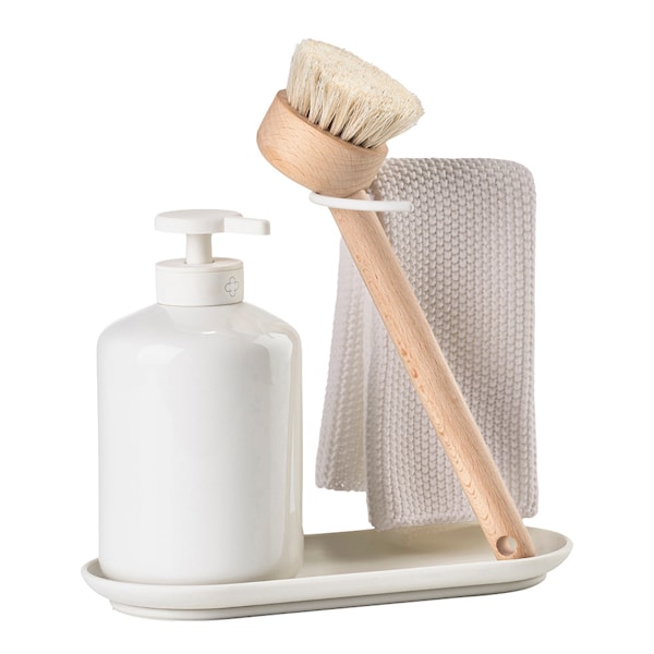 Inu Diskset 20 cm i Offwhite från Zone erbjuder allt som behövs för den dagliga diskningen – varken mer eller mindre. Med en bekväm borste, en rymlig tvålpump, en matchande disktrasa och en silikonbricka som förskönar diskplatsen. Setets stålram är elegant rundad upptill, vilket skapar en vacker halvcirkelform sedd från ovan. Dess lättanvända konstruktion gör det enkelt att flytta setet vid behov. Samtidigt ger ramen en stabil plats för borsten att vila på och trasan att torka. Ett genomtänkt och elegant designat set från NEU Studio som utstrålar delikat femininitet."