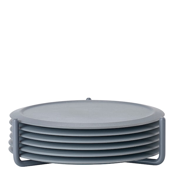 6-pack glasunderlägg i silikon. En mjuk och tyst landning – det är det bästa sättet att beskriva ljudet när du ställer ett glas på underlägget, och tack vare underläggets material står glaset stadigt på bordet. Glasunderläggen kommer i en praktisk metallhållare och är lätta att rengöra.