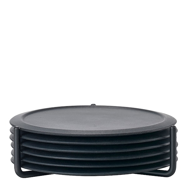 6-pack glasunderlägg i silikon. En mjuk och tyst landning – det är det bästa sättet att beskriva ljudet när du ställer ett glas på underlägget, och tack vare underläggets material står glaset stadigt på bordet. Glasunderläggen kommer i en praktisk metallhållare och är lätta att rengöra.