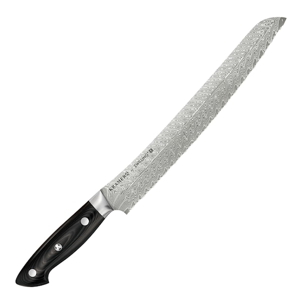 En klassik och högkvalitativ brödkniv ur serien Kramer från Zwilling. Knivens vassa, tandade blad gör att du utan krångel skär igenom den krispiga brödkanten. Med briljans skär den även igenom större frukter, exempelvis meloner och ananas. Brödkniven bibehåller sin vassa egg längre då den är tandad men vid behov av slipning bör den lämnas in på slipverkstad.