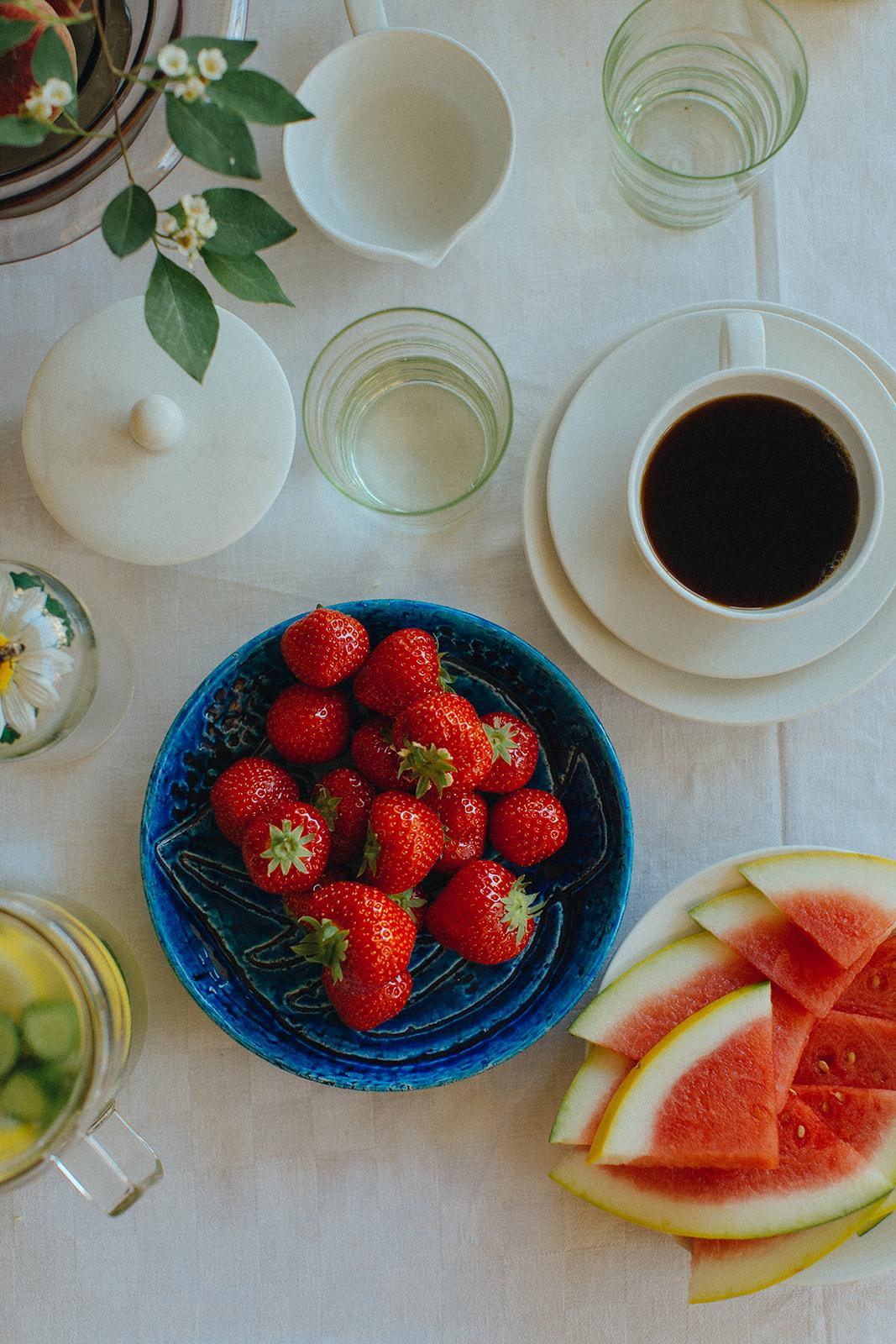 Gustav vet att en vacker dukning gör maten godare. Nymanglade dukar skapar den perfekta bakgrunden till udda koppar och glas. Och kronan på verket står den svenska sommaren för. Handplockade vilda blomster i utvalda vaser och skålar.